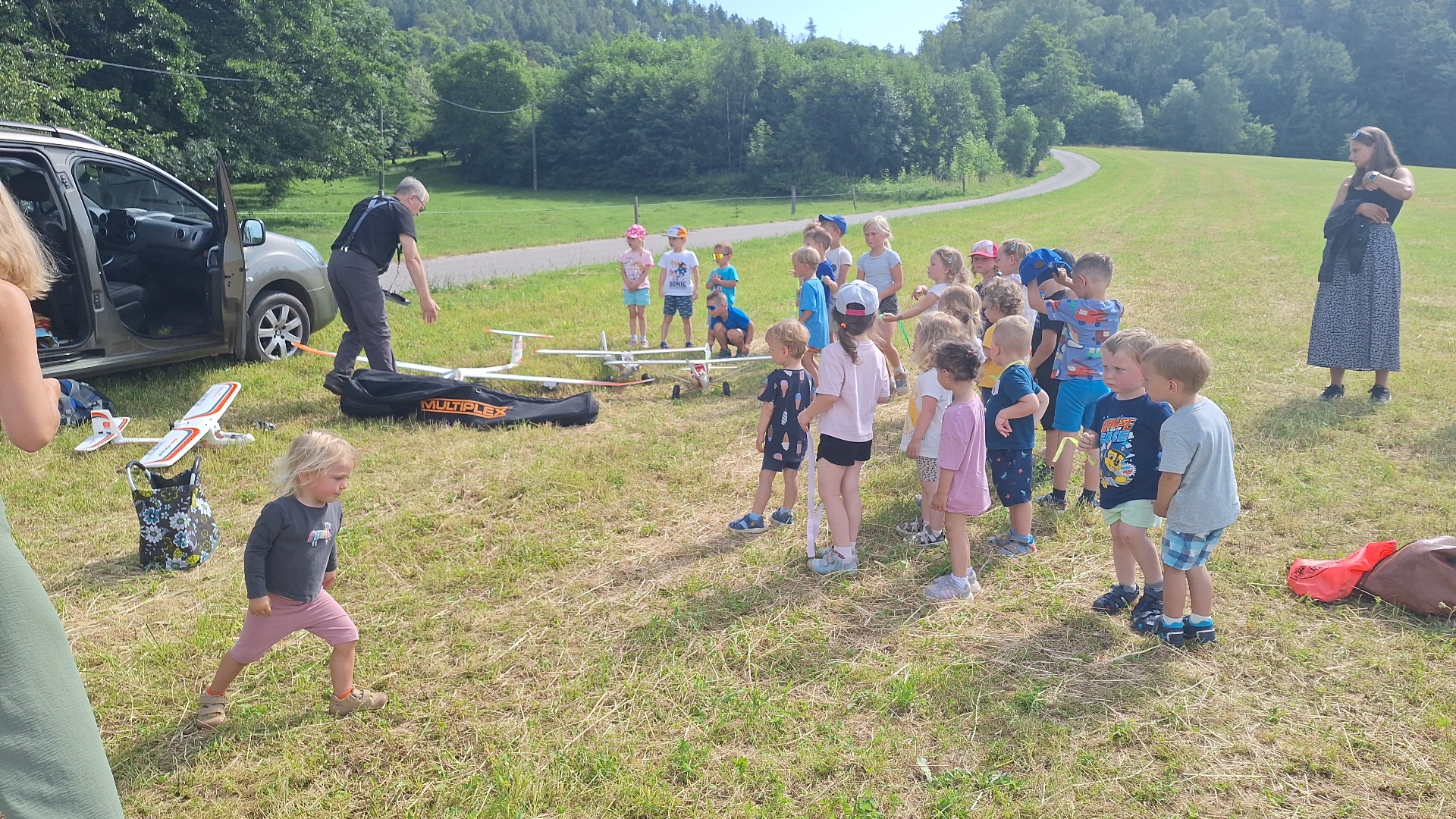 Přijel k nám dědeček naší Stellinky s autem plným letadel na dálkové ovládání a ukazoval nám co s nimi umí. Bylo to krásné a nejvíce se nám líbilo, jak ve výšce, za letu vypustil mašličky a na tom byly bonbónky.